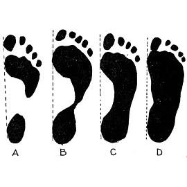 I have measured my feet and they are 4 1/8th W x 10 1/8th L with what looks to be closer to the A shape than B…wet footprint…thanks to dogs water…lol (yes, I gave them fresh cleaned bowl) shows a very slight side mark between heel and ball of my foot…high arches! Ugh!