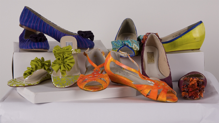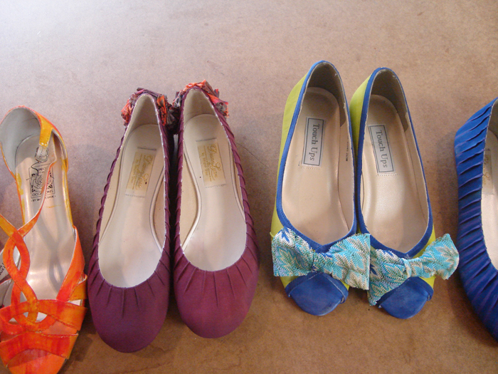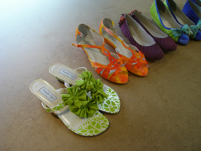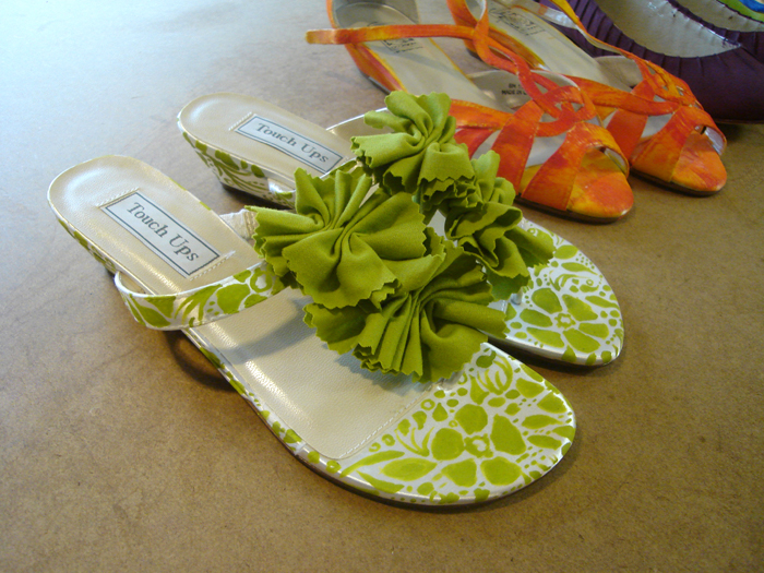 The traditional and gathered bows add the finishing touches to these hand painted shoes. The green-stenciled flowers of the Venus shoe create a lace overlay effect. This enhances the original satin fabric, which peeks through the unpainted spaces with brilliant shine. The details and color combinations pull every style together.